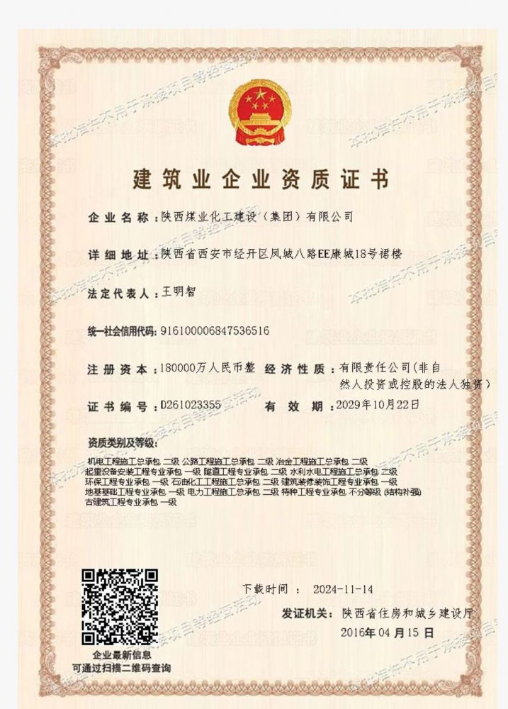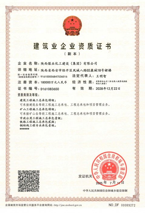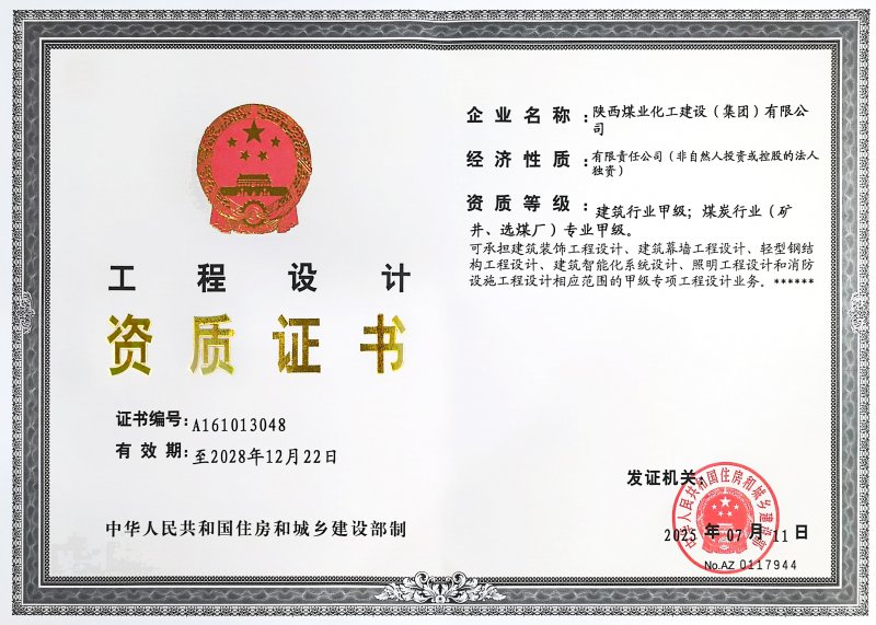 拥有建筑工程施工总承包、矿山工程施工总承包“双特级”资质和建筑行业甲级、煤炭行业(矿井、选煤厂)专业甲级设计资质;市政公用工程、钢结构工程、起重设备安装工程、环保工程、建筑装修装饰工程、地基基础工程、古建筑工程一级承包资质;机电工程、公路工程、冶金工程、铁路工程、水利水电工程、石油化工工程、电力工程、隧道工程二级承包资质,同时具有特种工程专业承包资质。